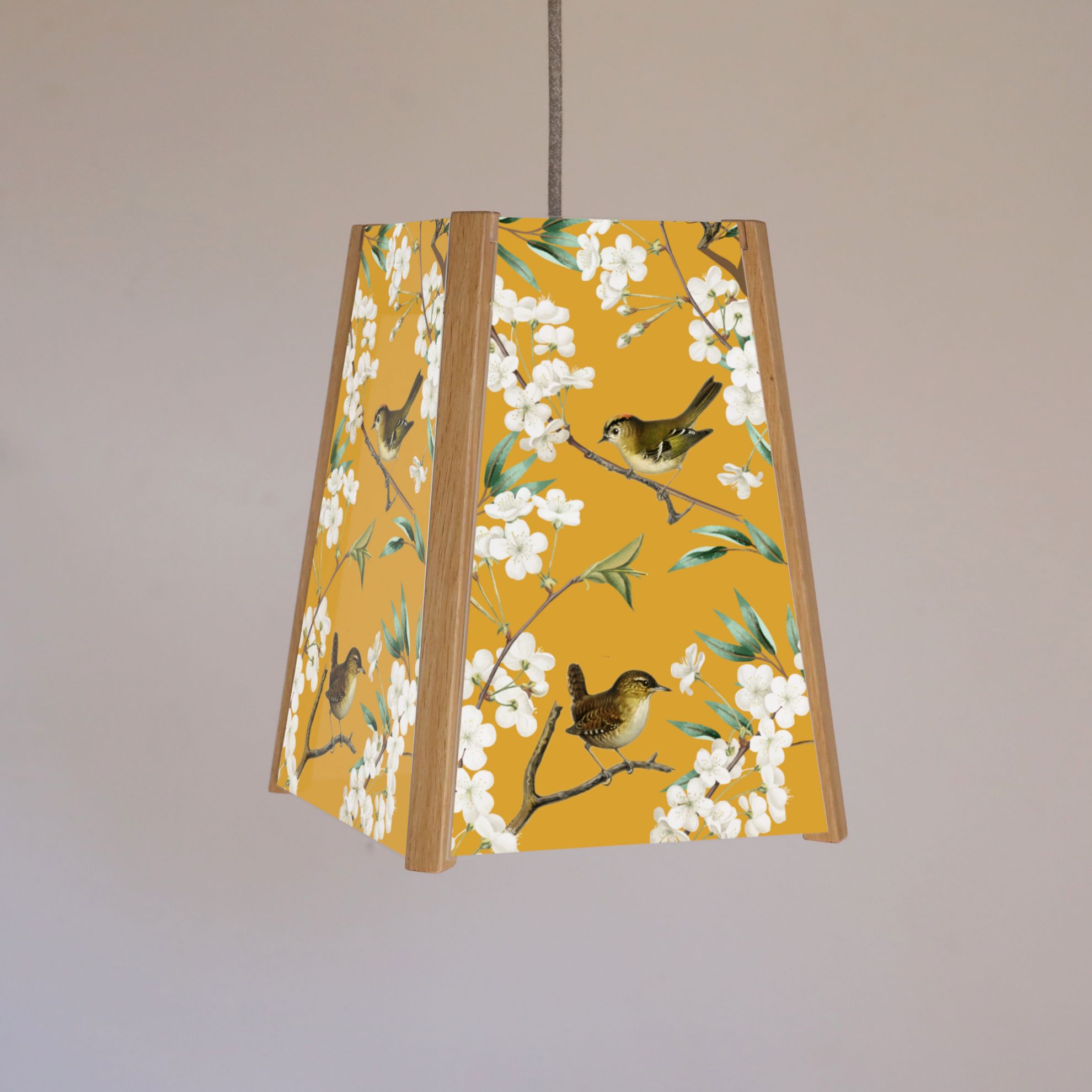 Design: A pretty blossom branch and bird design.Standard colours are returnable, special order colours are printed to order and are non-refundable.If you are unsure about the material/colour we offer a free sampling service before you buy, please contact us with your request.Extra panels can be purchased for this oak pendant, please see our other designs in the panel design section of our website.